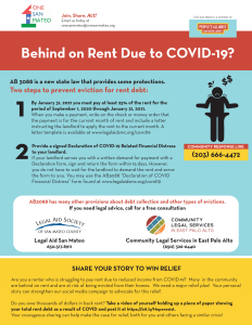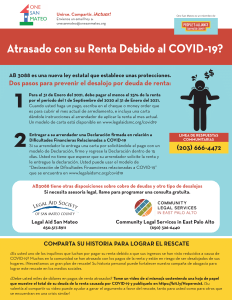 In recent weeks, One San Mateo, acting on behalf of the People’s Alliance of San Mateo County (PASMC), has overseen the creation and distribution of a mailer to 4,000 low-income renter households in San Mateo to make them aware of the protections afforded by AB 3088. A copy of this mailer in both English and Spanish is attached. Similar mailers have been sent to 14,000 households in other cities in San Mateo County bearing the logo of allied organizations that are also members of PASMC.